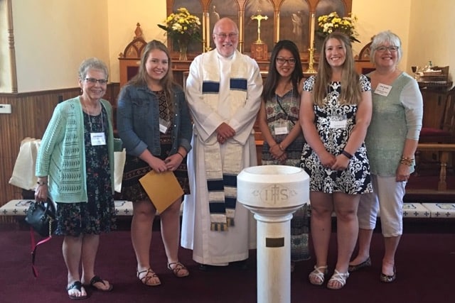 2017 CEC Scholarship Recipients (from left to right): Patti Masson (2017 Scholarship Ministry member); Kara Simpson, 2017 Charlevoix High School; Rev. Thomas P. O’Dell (rector CEC); Jenna Guthrie, 2017 Charlevoix High School; Lauren Harris 2017 East Jordan High School; and Pam Sroufe (2017 Scholarship Ministry member).