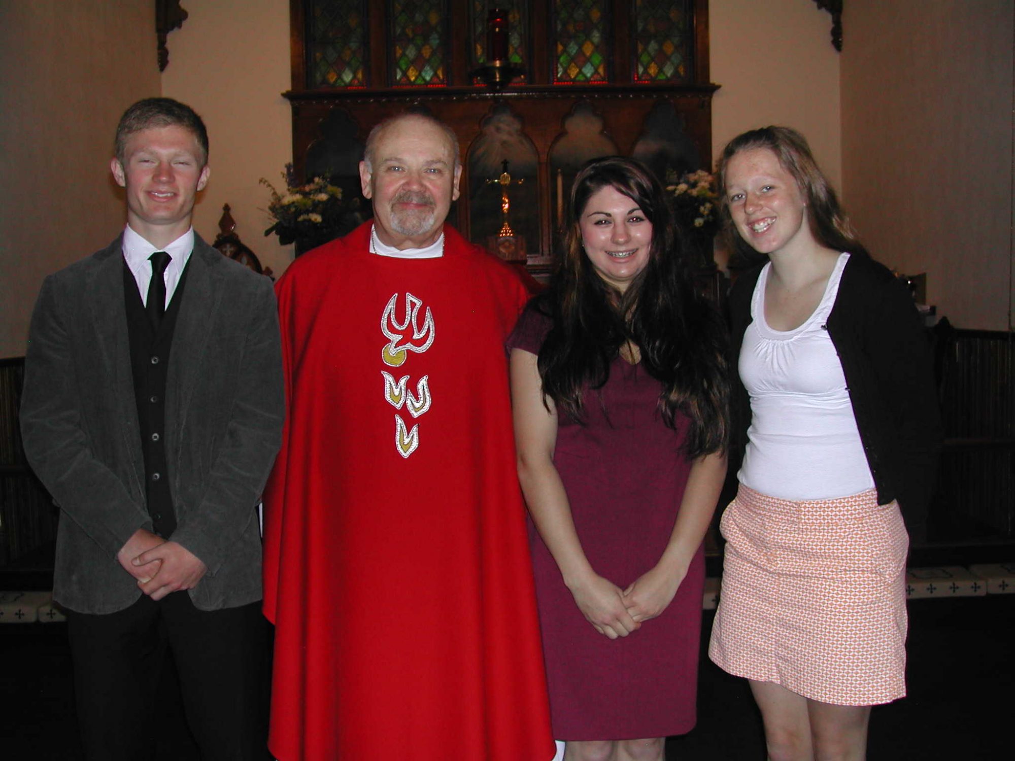 2012 CEC Scholarship Recipients (l-r): Luke Hawley (East Jordan HS), Father John David, Mikayla Thorman (Ellsworth HS), Christina Russell (Charlevoix HS)