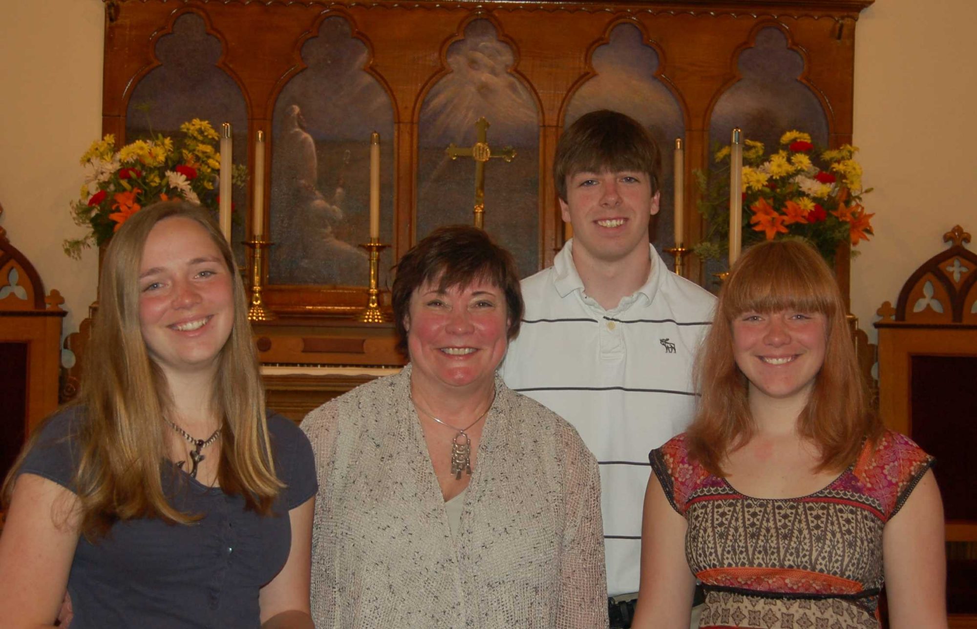 2014 CEC Scholarship Recipients (from l-r): Nancy Porter (CEC Scholarship Chairperson), Dustin Hejka (East Jordan High School), Jackson Buday (Charlevoix High School), Paul Esch-Laurent (Boyne City High School), and the Rev. Thomas O’Dell (Rector of Christ Church).